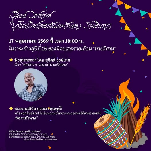 ‘ลึกซึ้งรากเหง้า เข้าใจปัจจุบัน รู้ทันอนาคต’ นิตยสาร “ทางอีศาน” ทางอีศาน“ ฉบับที่ ๑๖๘ ปีที่ ๑๔ เดือนเมษายน ๒๕๖๙ ภาพประดับปก : บุญนำ สาสุด เรื่องเด่นประจำฉบับจดหมายเหตุ“๒๐๐ ปีศึกเจ้าอะนุวง” : จดหมายรับสั่ง กรมพระราชวังบวรมหาศักดิพลเสพ ถวายรายงานทัพกราบบังคมทูลแด่พระบาทสมเด็จพระนั่งเกล้าเจ้าอยู่หัว | กำพล จำปาพันธ์“มองสภาพอีสานผ่านงานสาธารณสุข” | มุมมองนายแพทย์ณัฐวุฒิ มาสาซ้าย ผู้อำนวยการโรงพยาบาลโกสุมพิสัย “นกสันติภาพ” ขยับปีกบินในสหรัฐ | ชลธิรา สัตยาวัฒนาพระภิกษุชาวลาว ผู้ประสบอุบัติเหตุระหว่างก...Read More